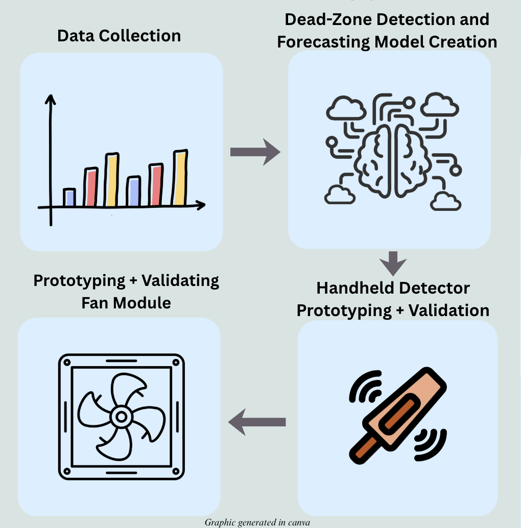 In the modern household, around 2.1 billion people worldwide cook using open fires or inefficient stoves fueled by harmful chemicals, with over 3.2 million people per year dying due to air pollution (WHO, 2025), carbon monoxide (CO) poisoning being one of the deadliest (EIA, 2024). In the body, CO binds to hemoglobin, inducing hypoxia, lack of oxygen, which can kill a person within a matter of minutes. Currently, around 400 people die a year due to CO poisoning with around 100,000 emergency visits per year (CDC, 2025). Current electrochemical sensors, despite being economical, are affected severely by environmental sensitivities such as hydrogen gas and carbon dioxide, while lacking advanced forecasting capabilities. Additionally, current residential ventilation systems tend to contain leftover pollutants, consume high amounts of energy, and aren’t suited for autonomous poisonous gas filtration, with the current residential ventilation fan module costing upwards to $300; Additionally, advanced and autonomous filtration capabilities are exclusive to only commercial or industrial fans. The goal of this project is to design a novel, dual-mode carbon monoxide dead-zone detection and ventilation system that not only detects dead-zones, areas with little circulation but high levels of CO, and forecasts future CO levels for users to install detectors in those areas, but also smartly informs the user where carbon monoxide might be building up for further action.