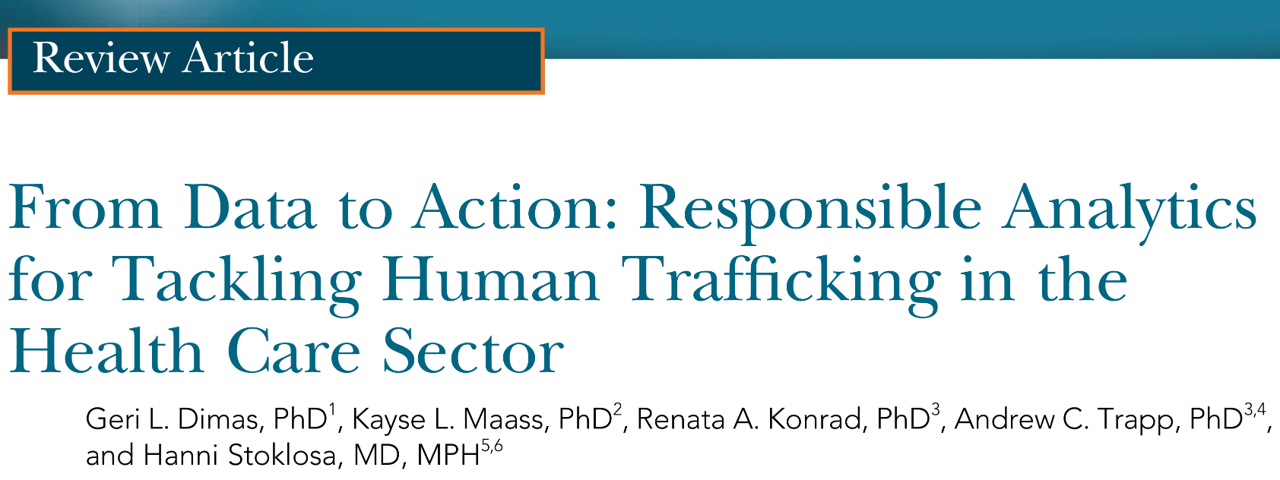 Our paper From Data to Action: Responsible Analytics for Tackling Human Trafficking in the Health Care Sector with Geri L. Dimas, Kayse L. Maass, Renata A. Konrad, and Hanni M. Stoklosa now appears at Journal of Forensic Nursing. The paper surveys responsible analytics and discusses practical, decision-relevant ways that data can support efforts to recognize and respond to trafficking in the health care sector.