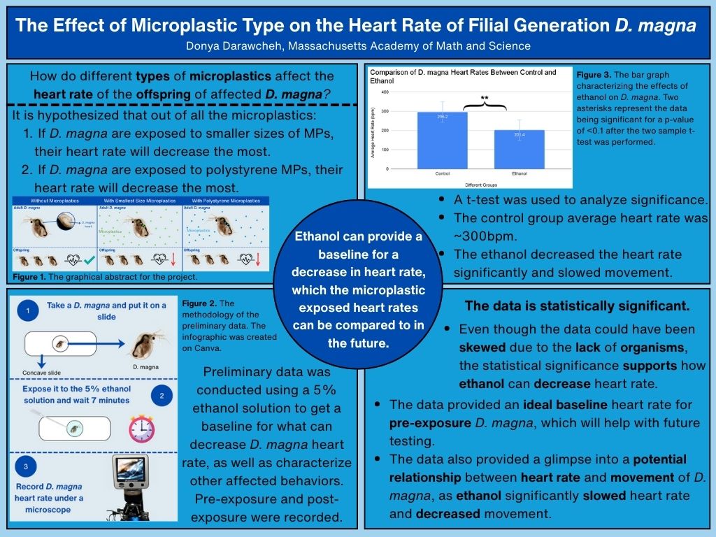 The data suggests that microplastics can decrease the heart rate of D. magna, with polyethylene decreasing the heart rate more than polypropylene. The data also suggests that microplastics do have an effect on mortality, and that when consumed microplastics primarily end up in the gut. This specifically aligns with what Wang et al. found in 2022, as when investigating polyethylene microplastic toxicity on D. magna, they also found that the microplastics primarily ended up in the gut. This data provides initiative to continue to investigate microplastic effects, such as how different sizes of microplastics can affect heart rate and mortality, how different sizes and polymers of microplastics can affect egg production, and how different sizes and polymers of microplastics can affect the heart rate of filial generation D. magna.