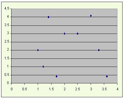 {(1,2),(1.2,1),(1.4,4),(1.7,0.4),(2,3),(2.5,3),(3,4.1),(3.3,2),(3.6,0.4)} yields a correlation of only -0.0221