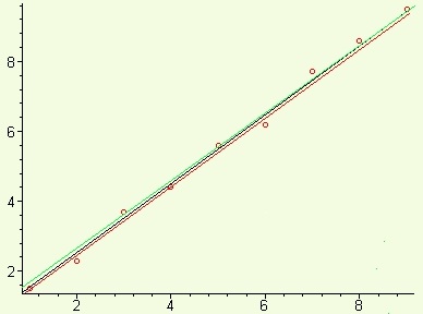 These three lines are not that different, but which is more accurate than the others at going through the data and enabling us to predict values for of whatever is being measured for domain values of 4.5 and 7.5, where there are no measurements? Is there another line that is more accurate? This is the domain of regression analysis: a systematic approach with a rational basis for estimating a best graph for some data.