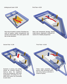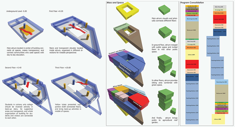 The main design challenge was the integration of public and private spaces. Semi-transparent facade in lower levels invites the community to visit the restaurant and blends interior and exterior. The central atrium with unique shape embraces vertical circulation and provides continuous visual connectivity throughout the blossom building. In the first floor, the atrium merges with the public spaces; An invitation for exploring other levels and experiencing the daily life in the college. Public permaculture roof garden improves the energy efficiency of the building and provides sustainable food and resources to locals and the college; on the way up to the green roof, community explores other spaces and learns about design and technique of food preparation. Multiple Staircases and transparent elevator in the atrium create animated perspectives that alter depending on your location in the building.